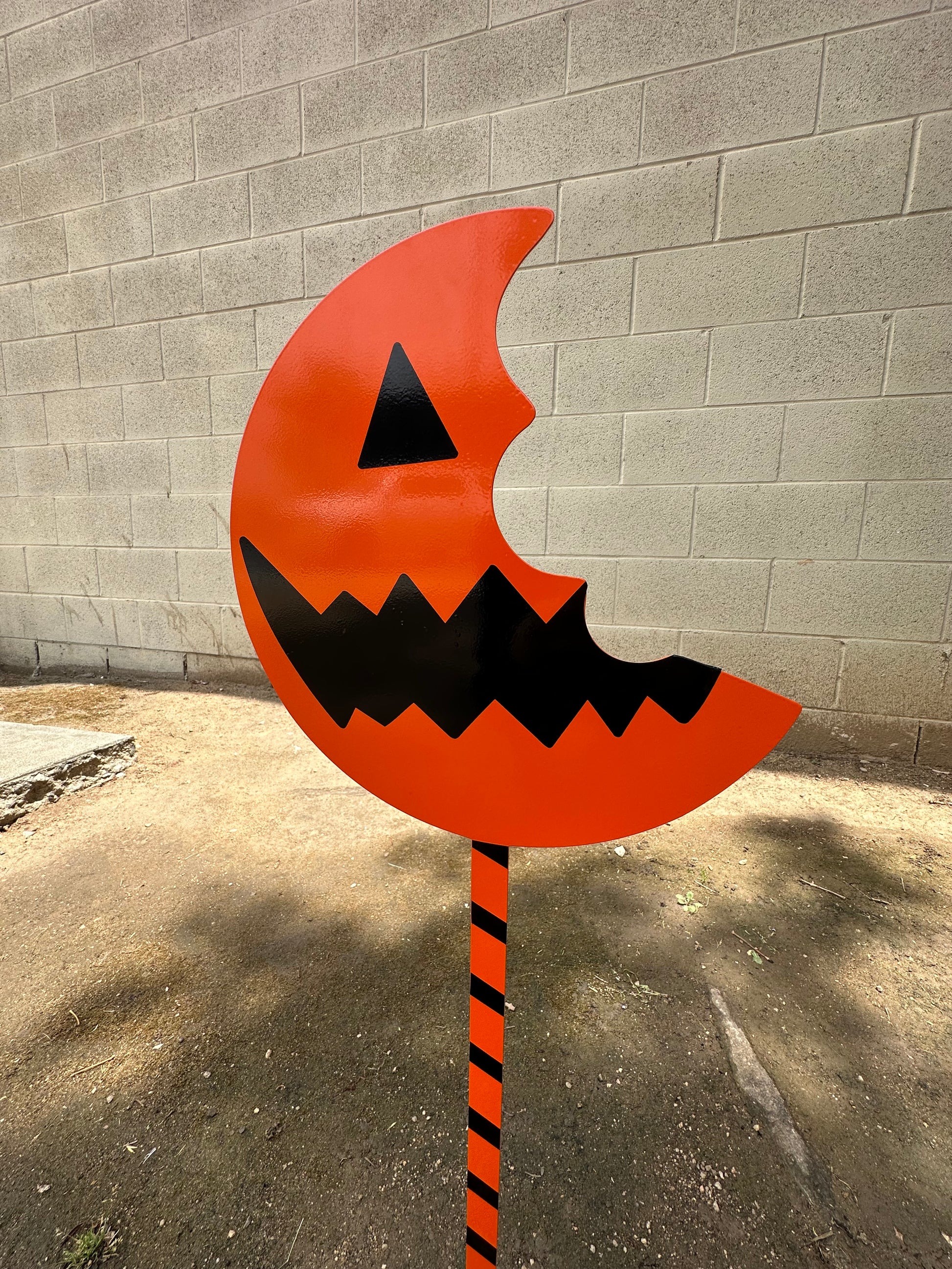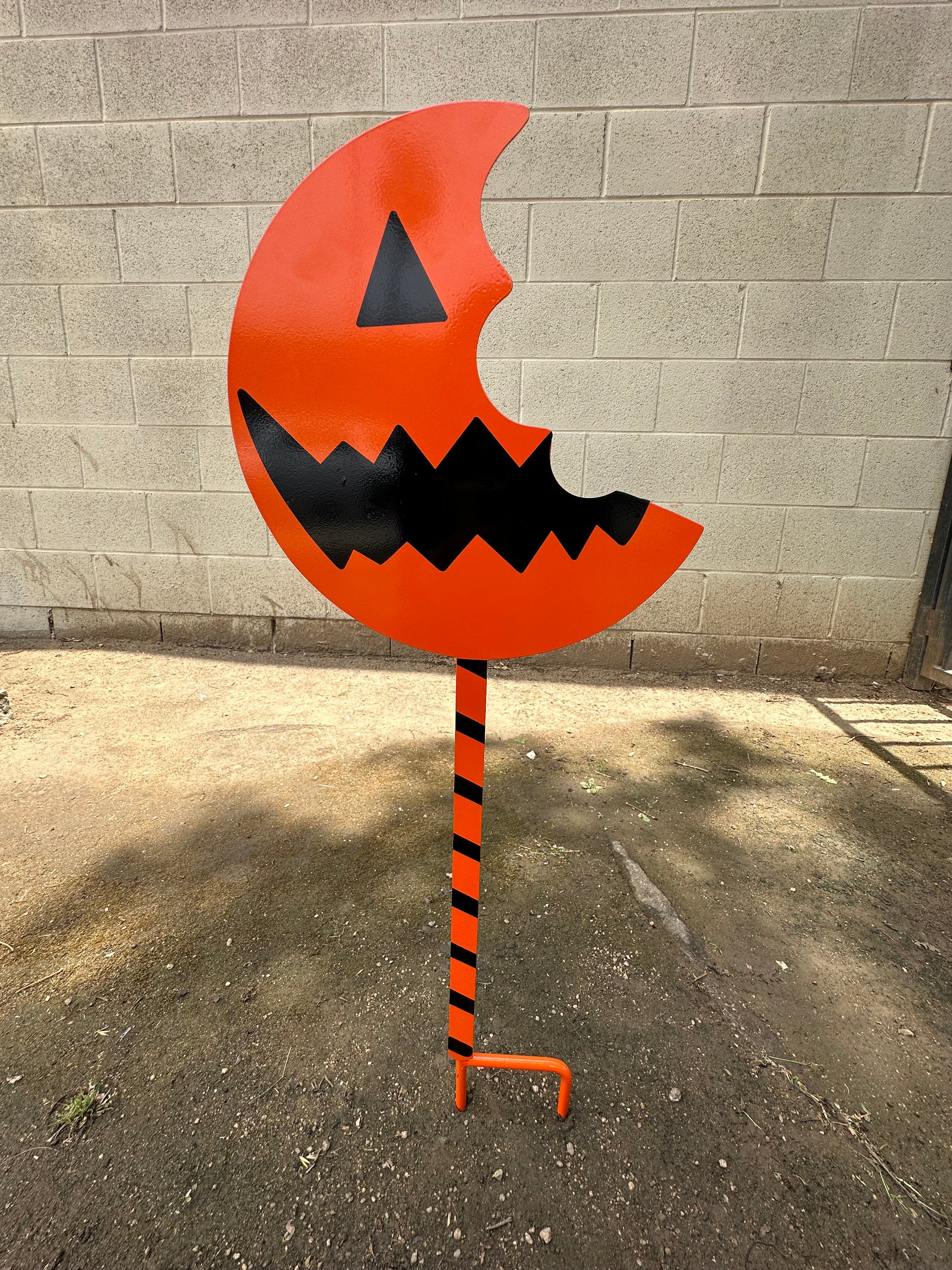 16ga steel welded garden stake, powder coated orange with black vinyl decals.